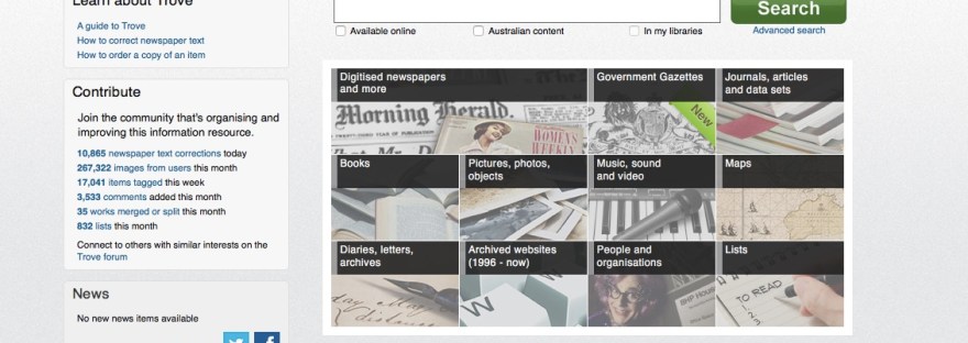 The featured image is a screenshot of the Trove homepage, an on-line resource provided by the National Library of Australia.